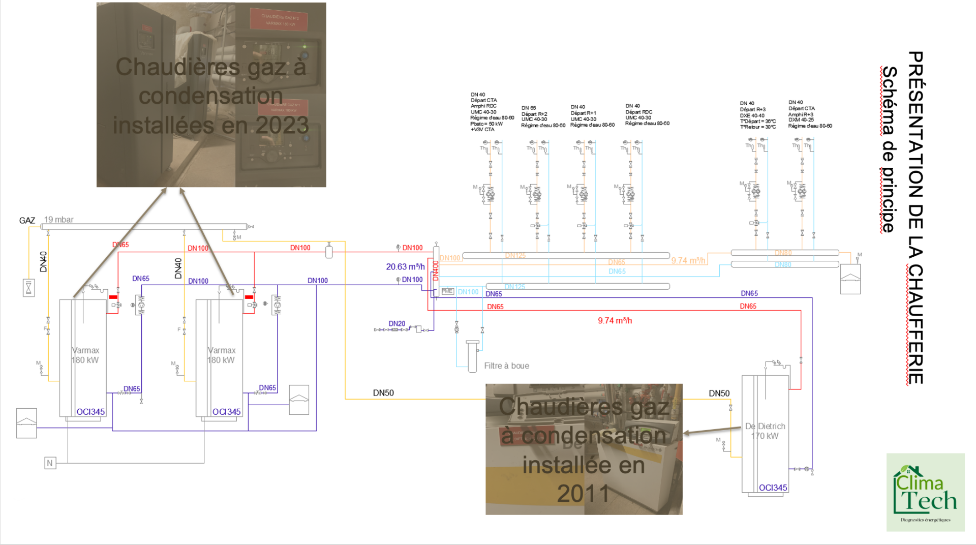 Nous sommes allés dans le local chaufferie pour examiner la chaudière en fonctionnement : ses raccordements, ses équipements de régulation, le départ/retour chauffage, et le système de production d’eau chaude.