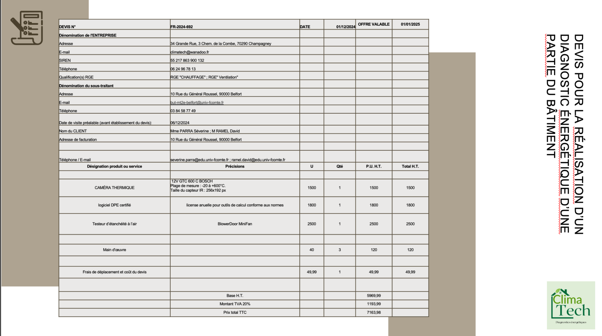 Pour compléter notre étude, nous avons réalisé un devis détaillé afin de chiffrer les équipements nécessaires à la mise en place d’une campagne de mesures complète dans le bâtiment.